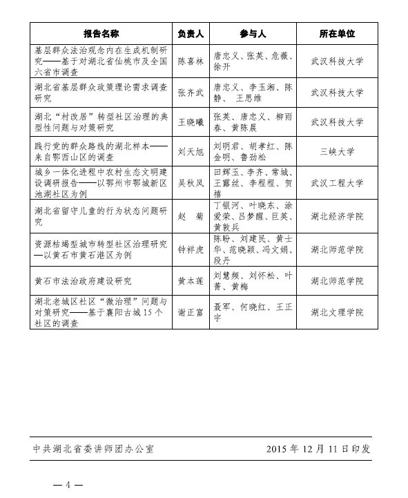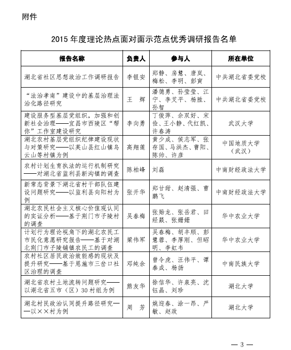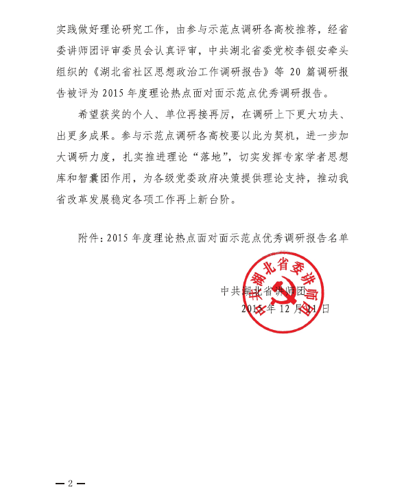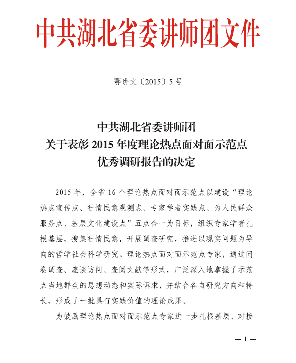 近日,中共湖北省委讲师团下发表彰决定(鄂讲文[2015]5号),对20篇2015年度理论热点面对面示范点优秀调研报告进行表彰。我院吴春梅教授作为负责人的调研报告《湖北农民社会主义核心价值观认同的实证分析——基于荆门市子陵村的调查》和梁伟军副教授作为负责人的调研报告《计划行为理论视角下的湖北农民工市民化意愿调研报告——基于对湖北荆门市子陵铺镇农民工的调查》同时被评为优秀调研报告,受到表彰。