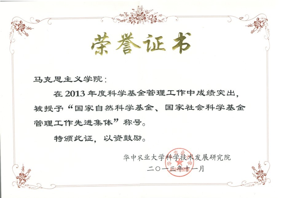 2013年度,我院进一步加强学科建设,推动学术交流,激励科学研究,动员并组织教师积极主动申报各级各类基金项目,同时,还进一步加强了学术道德建设,强化了各类基金项目申报、实施和经费使用的规范管理工作,成效明显。据统计,截至目前,我院今年已新增国家社科基金项目6项、教育部人文社科项目2项、全国高等学校博士学科点专项科研基金项目1项、省社科基金项目5项、全省高校优秀思想政治理论课教师择优资助计划项目1项。