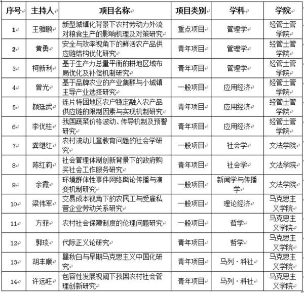 根据全国哲学社会科学规划办公室近日公布的2013年度国家社会科学基金项目立项结果公告,我院在多个学科的项目申报中取得突破,喜获丰收,由我院教师梁伟军、方菲、郭琰、胡丰顺、许远旺分别主持申报的5个项目获批立项资助(详见下列一览表)。这5个项目分布在三大学科领域,其中,马列•科社2项,哲学2项,理论经济1项。这些项目获批立项,是我院今年继获批立项2个教育部人文社科研究项目和4个湖北省社科基金项目之后传来的又一大喜讯。据分析,我院今年获批立项资助的这些项目选题比较新颖,内容紧扣国家经济社会发展重大理论和实践需求,研究视角富有特色,立项论证逻辑比较严密,研究设计可行性较强,并有较好的前期研究基础。这些项目获批立项资助,有利于进一步提升我院教师的理论自信、学科自信、学术自信和职业自信,有利于进一步激发大家从事马克思主义理论研究和传播的积极性主动性创造性,有利于进一步推动我院马克思主义理论学科的建设和发展。