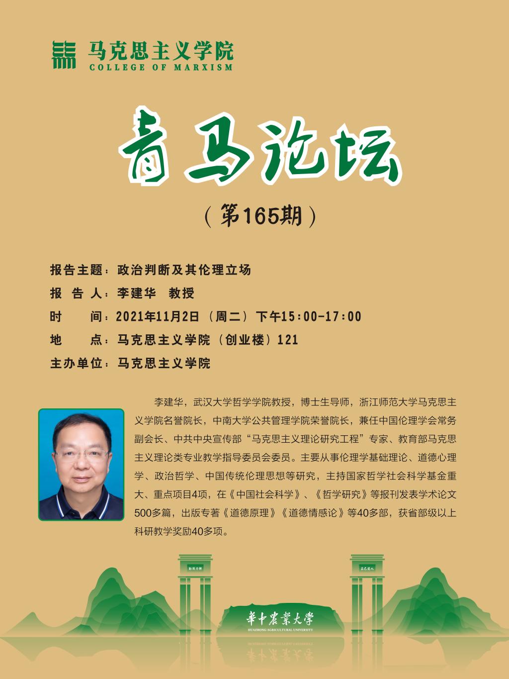 11月2日下午,武汉大学哲学学院李建华教授做客青马论坛。李建华教授以“政治判断及其伦理立场”为主题,为学院师生带来一场精彩的学术盛宴。校党委副书记、纪委书记廖济忠、学院领导及师生参加论坛报告,报告由院长梁伟军主持。