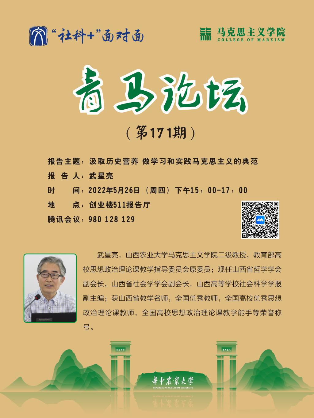 5月26日下午,第171期青马论坛于创业楼511报告厅举行。山西农业大学9428cn太阳集团武星亮教授应邀在线作“汲取历史营养 做学习和实践马克思主义的典范”学术报告,报告由院长梁伟军主持。