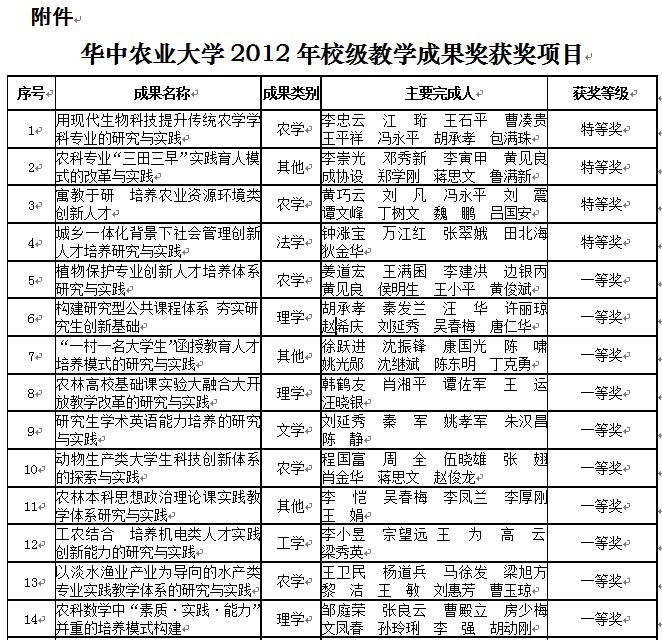 据悉,我校校级教学成果奖每四年评审表彰奖励一次。本次表彰奖励的34个项目是经项目组申请、各有关单位审核推荐、校级教学成果奖评选委员会评审产生的。经公示,无异议,这些项目获奖全部有效。其中,《用现代生物科技提升传统农学学科专业的研究与实践》等4项成果获校级教学成果特等奖,《植物保护专业创新人才培养体系研究与实践》等13项成果获校级教学成果一等奖,《师生和谐互动的学术育人体系研究与实践》等17项成果获校级教学成果二等奖。本次获奖项目从总体上反映了我校近年来教学改革的水平和成就。