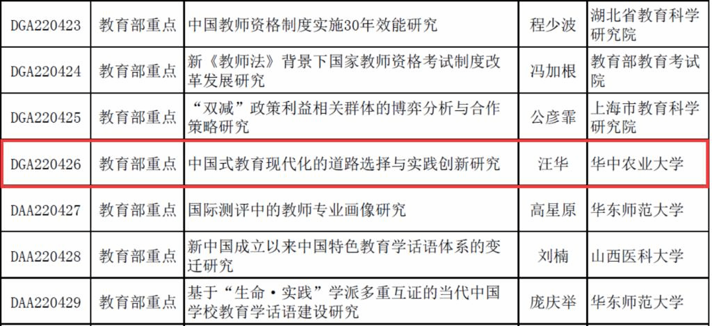 近日,全国教育科学规划领导小组办公室公布了全国教育科学“十四五”规划2022年度立项课题名单,我院汪华副教授项目《中国式教育现代化的道路选择与实践创新研究》获批全国教育科学规划课题教育部重点立项。