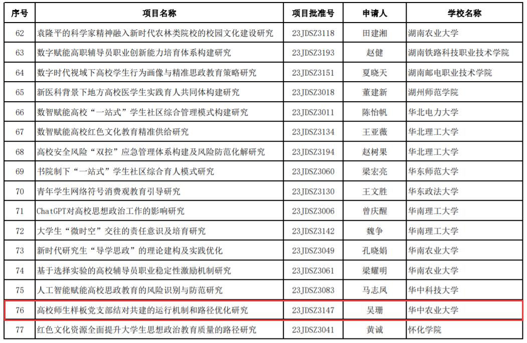 近日,教育部社会科学司公布了2023年度教育部人文社会科学研究专项任务项目(高校辅导员研究)立项结果。我院吴珊老师申报的《高校师生样板党支部结对共建的运行机制和路径优化研究》获批立项。