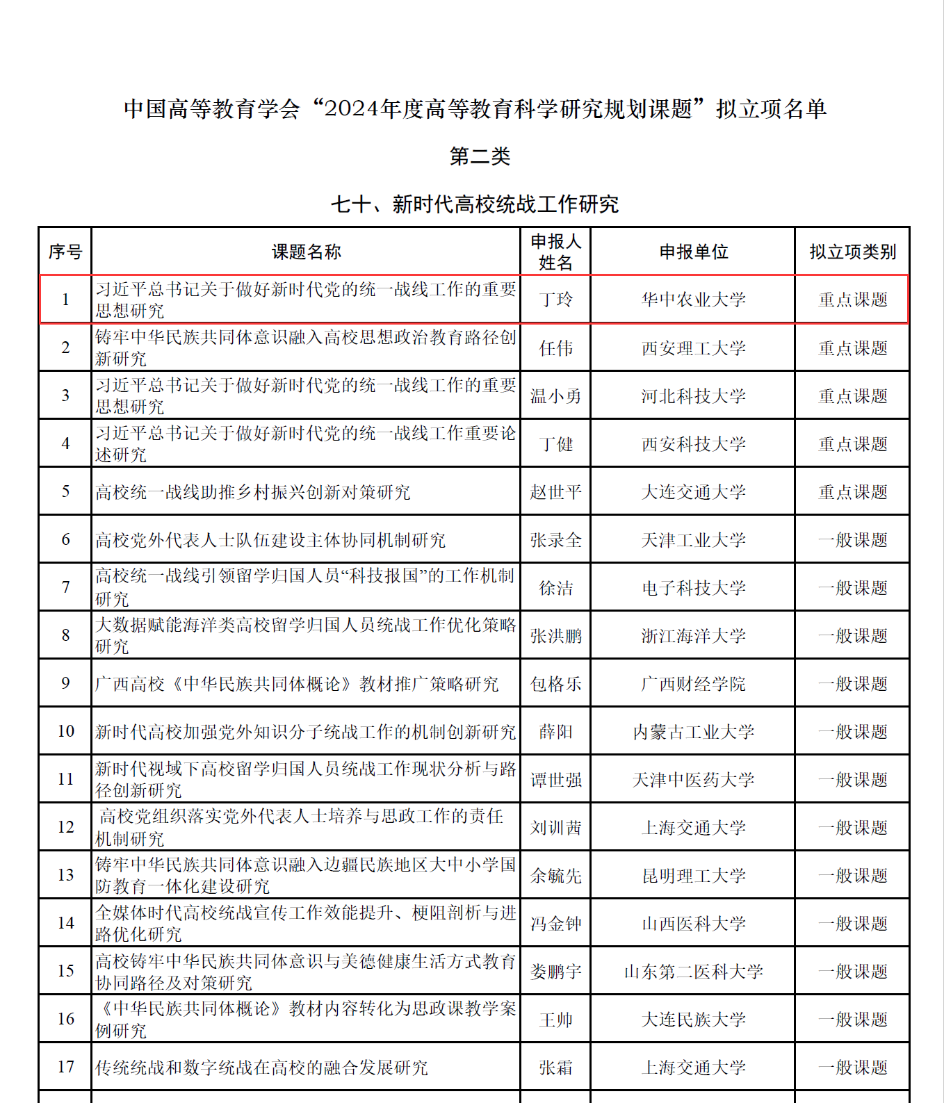 近期,中国高等教育学会公布“2024年度高等教育科学研究规划课题”立项名单,我院丁玲副教授《习近平总书记关于做好新时代党的统一战线工作的重要思想研究》成功立项重点课题。