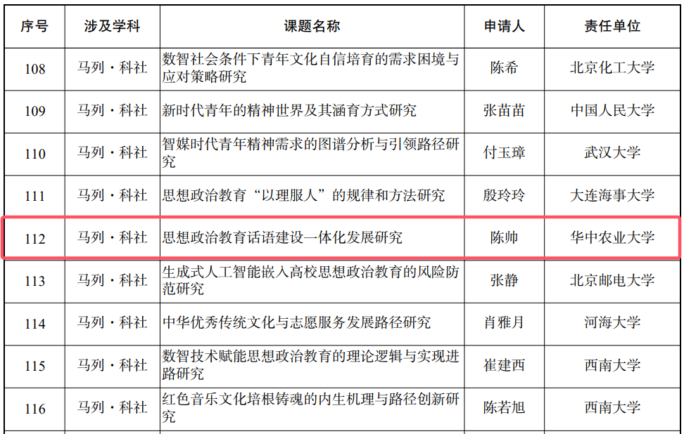 9月14日,全国哲学社会科学工作办公室公布了2024年国家社科基金年度项目和青年项目立项名单。我院陈帅副教授项目《思想政治教育话语建设一体化发展研究》获批2024年国家社科基金青年项目立项。