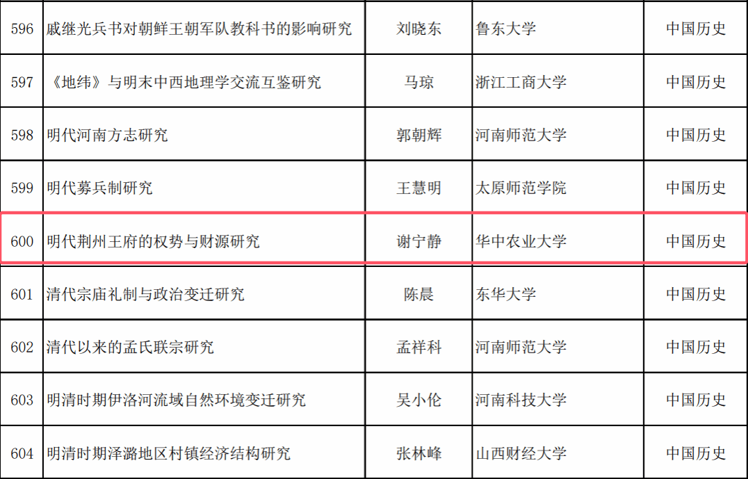 1月17日,全国哲学社会科学工作办公室公布了2024年度国家社科基金后期资助暨优秀博士论文出版项目立项名单。我院谢宁静博士项目《明代荆州王府的权势与财源研究》获批国家社科基金后期资助暨优秀博士论文出版项目立项。