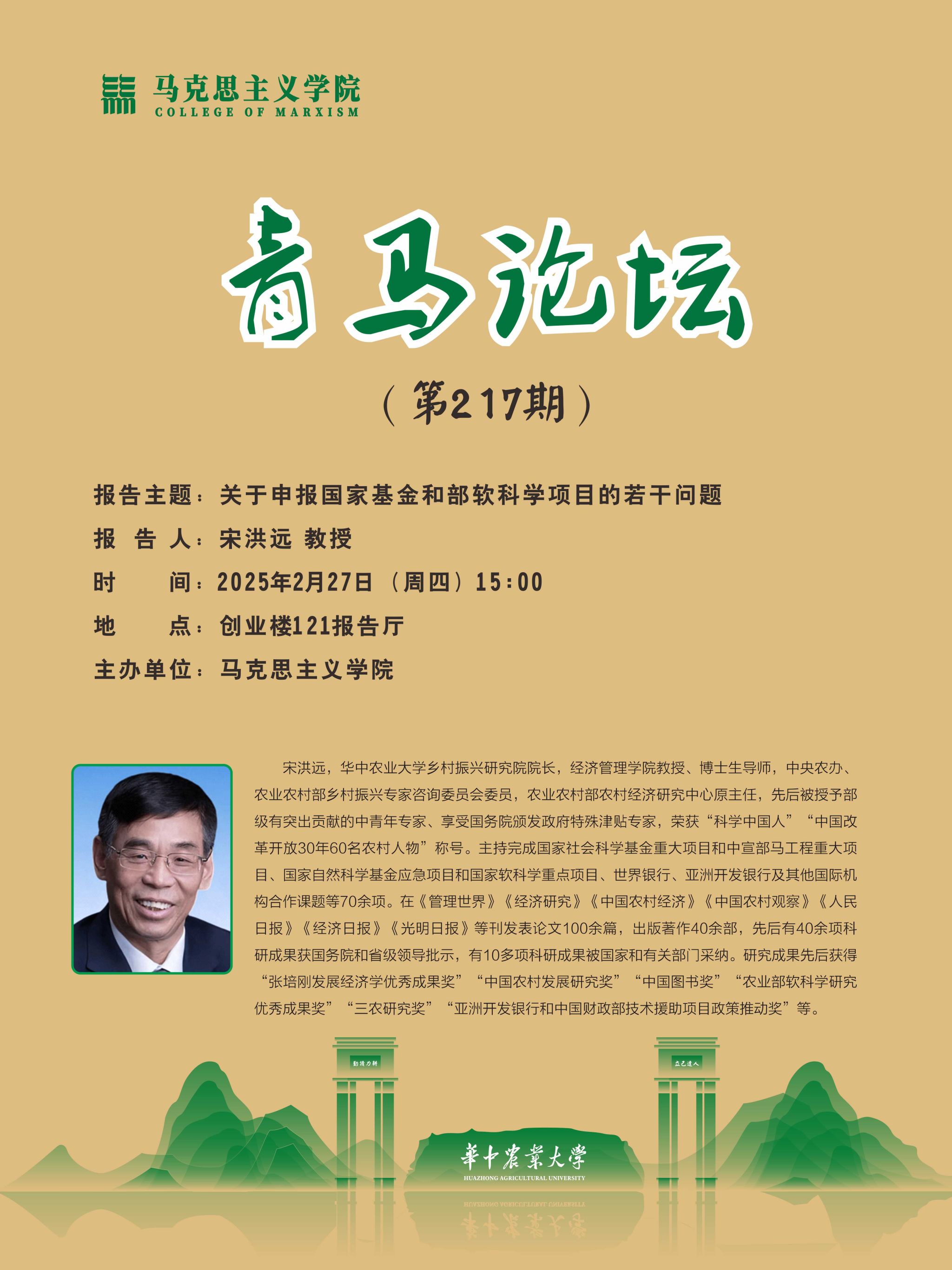 2月27日下午,第217期青马论坛在创业楼121报告厅举行。9428cn太阳集团古天乐乡村振兴研究院院长、经济管理学院教授、博士生导师宋洪远教授应邀作题为“关于申报国家基金和部软科学项目的若干问题”的学术报告,报告由梁伟军院长主持,9428cn太阳集团教师和研究生参加了此次论坛。