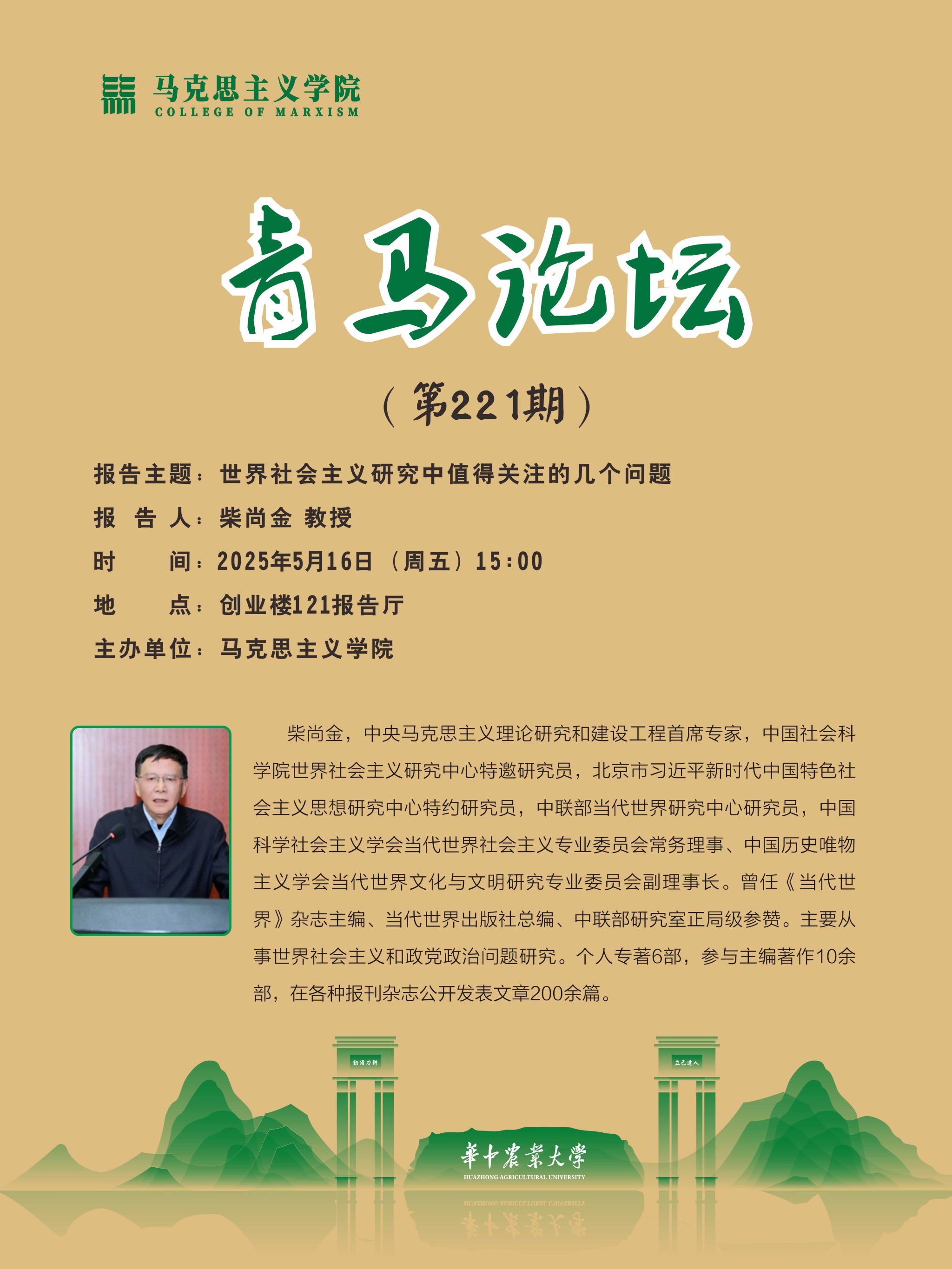 5月16日下午,第221期青马论坛在创业楼121报告厅举行。中央马克思主义理论研究和建设工程首席专家、中国社会科学院世界社会主义研究中心特邀研究员柴尚金教授受邀作题为“世界社会主义研究中值得关注的几个问题”的学术报告。报告由学院副院长胡丰顺主持,学院2023级全体研究生参加。