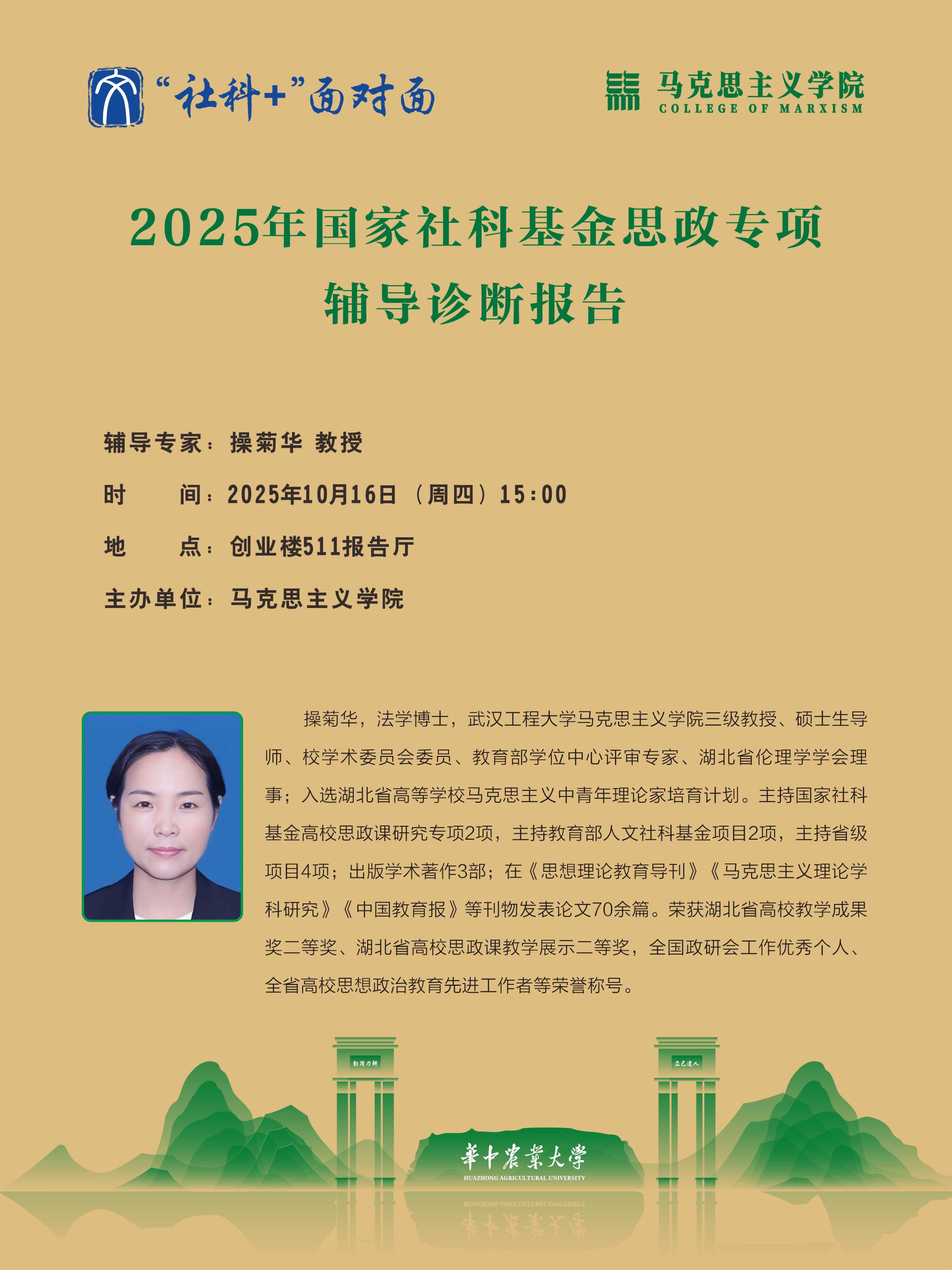 10月16日下午,2025年国家社科基金思政专项辅导诊断报告在创业楼511报告厅举行。武汉工程大学9428cn太阳集团教授、教育部学位中心评审专家操菊华教授应邀作“国社科思政专项申报体会”专题辅导报告,报告会由副院长胡丰顺主持。
