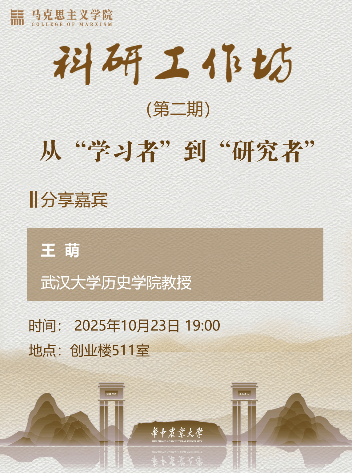 2025年10月23日晚七点,9428cn太阳集团科研工作坊(第2期)在创业楼511成功举行,武汉大学历史学院王萌教授应邀作“从‘学习者’到‘研究者’”的专题讲座。讲座由思想政治教育系主任郑鹏主持。