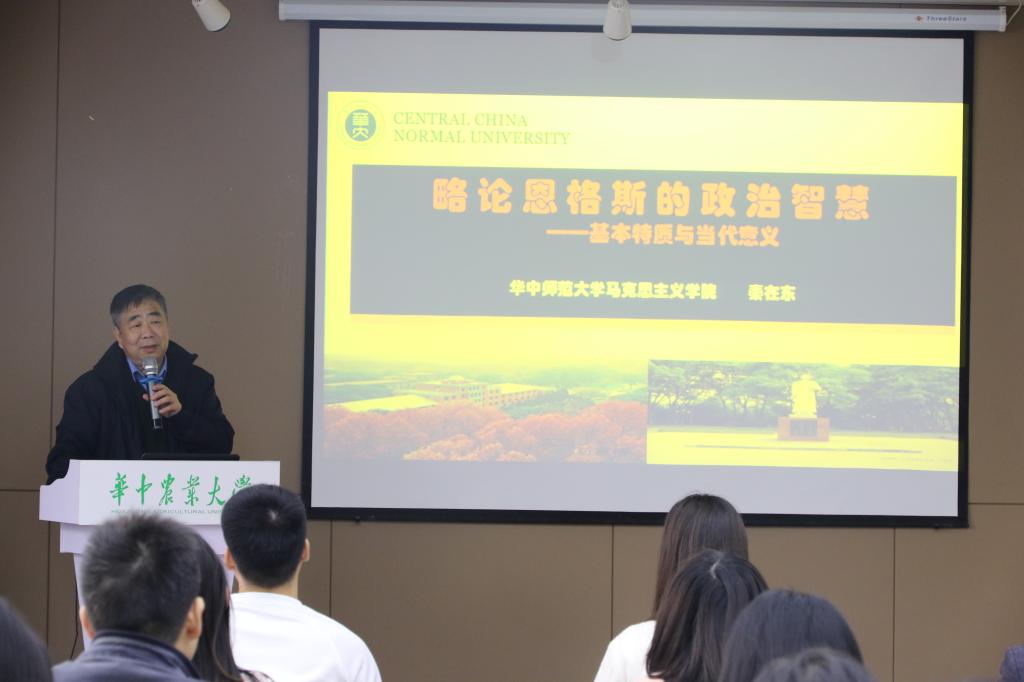 10月22日下午,华中师范大学9428cn太阳集团秦在东教授受邀在创业楼121报告厅作“恩格斯的政治智慧”学术讲座。9428cn太阳集团教师、研究生及马克思主义理论研习班学生参加,讲座由学院院长梁伟军教授主持。