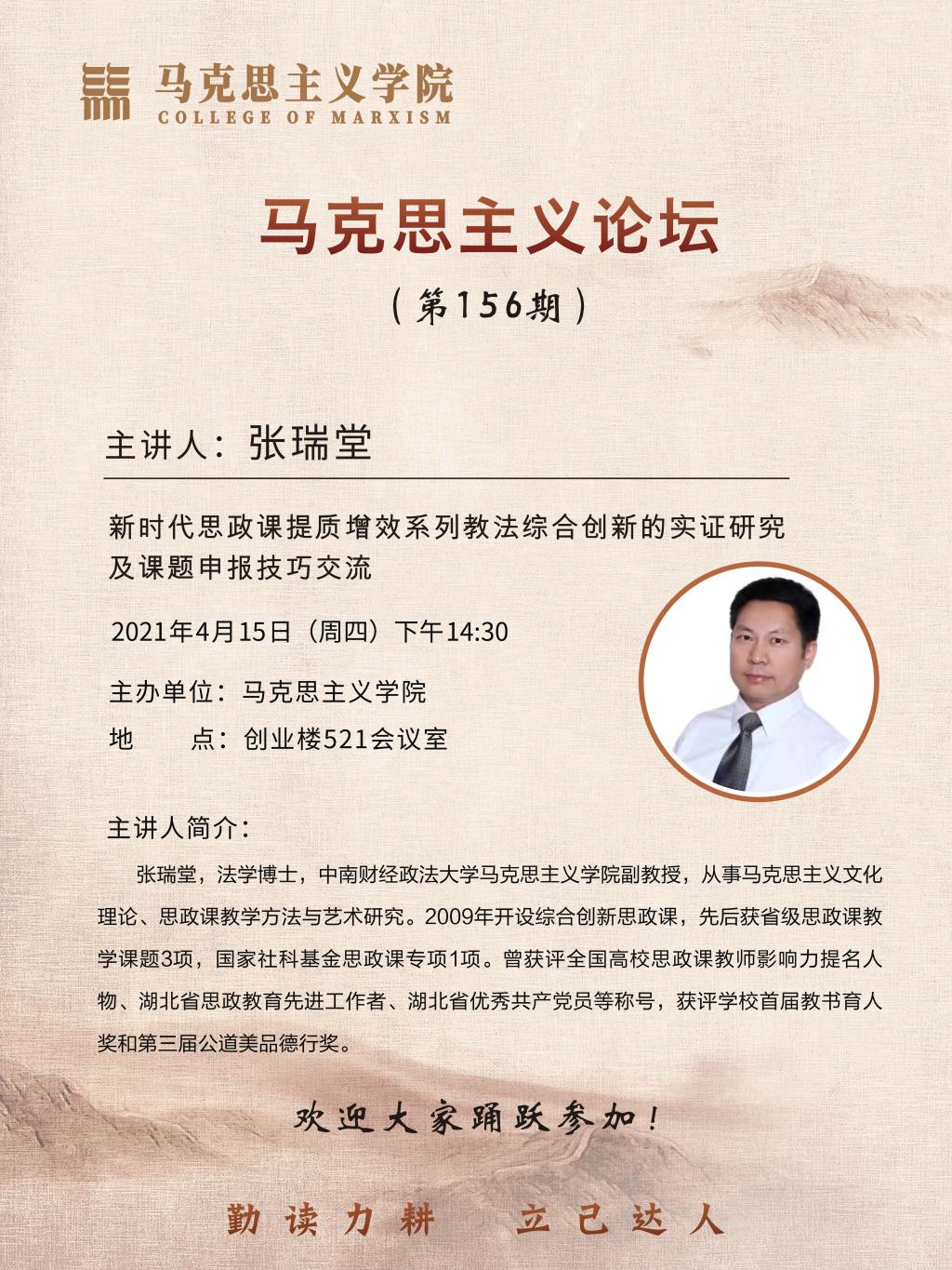 4月15日下午,“新时代思政课提质增效系列教法综合创新的实证研究及课题申报技巧”交流会在创业楼521会议室举行。中南财经政法大学9428cn太阳集团张瑞堂老师就思政课综合创新方案与系列教法与学院教师代表进行了分享交流,会议由胡丰顺老师主持。