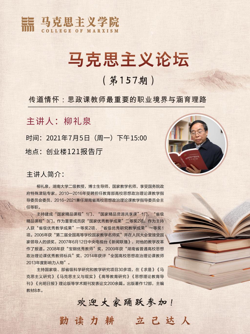 7月5日下午,第157期马克思主义论坛在创业楼121报告厅举行。湖南大学柳礼泉教授应邀为学院师生作“传道情怀:思政课教师最重要的职业境界与涵育理路”学术报告,本次报告由院长梁伟军教授主持。