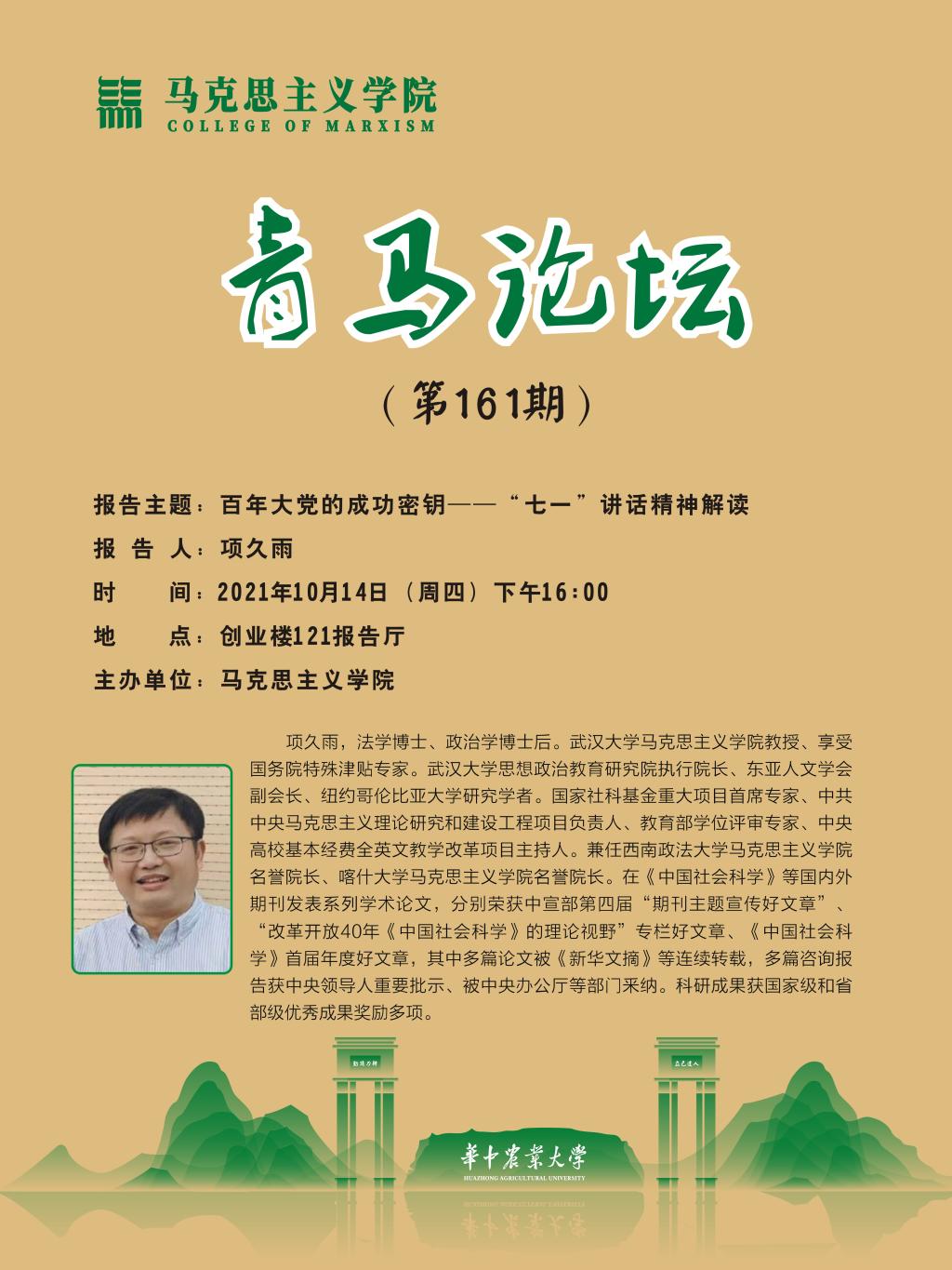 10月14日下午,第161期青马论坛于创业楼121报告厅举行。武汉大学9428cn太阳集团项久雨教授应邀作“百年大党的成功密钥——‘七一’讲话精神解读”学术报告。报告由院长梁伟军主持。