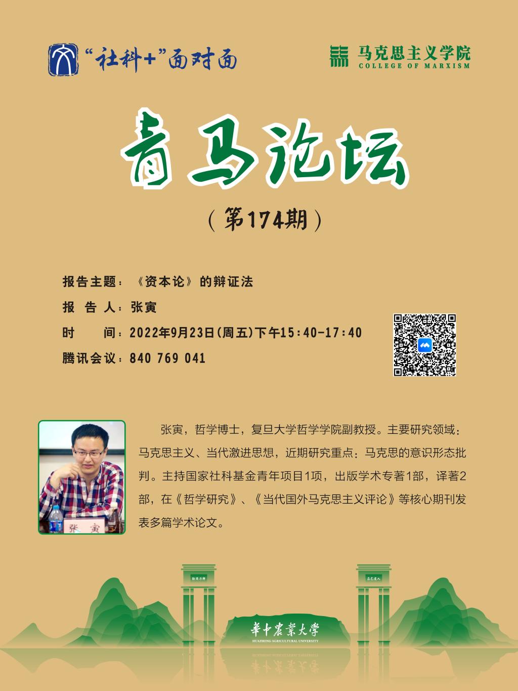 9月23日下午,第174期青马论坛于创业楼512会议室举行。复旦大学哲学学院张寅副教授应邀在线作“《资本论》的辩证法——对抗的三种形式”学术报告,报告由院长梁伟军教授主持。