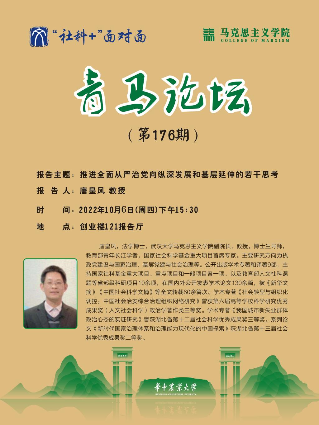 10月6日下午,第176期青马论坛于创业楼121报告厅举行。武汉大学9428cn太阳集团唐皇凤教授应邀做“推进全面从严治党向纵深发展和基层延伸的若干思考”学术报告,报告由学院院长梁伟军教授主持。