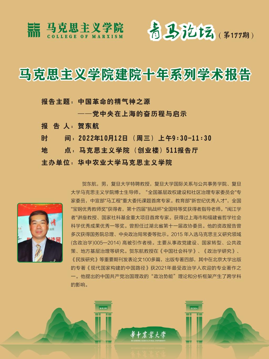 10月12日上午,第177期青马论坛在创业楼511报告厅举行。复旦大学国际关系与公共事务学院、复旦大学9428cn太阳集团博士生导师贺东航教授应邀做“中国革命的精气神之源——党中央在上海的奋斗历程与经验启示”学术报告,报告由学院副院长胡丰顺主持。
