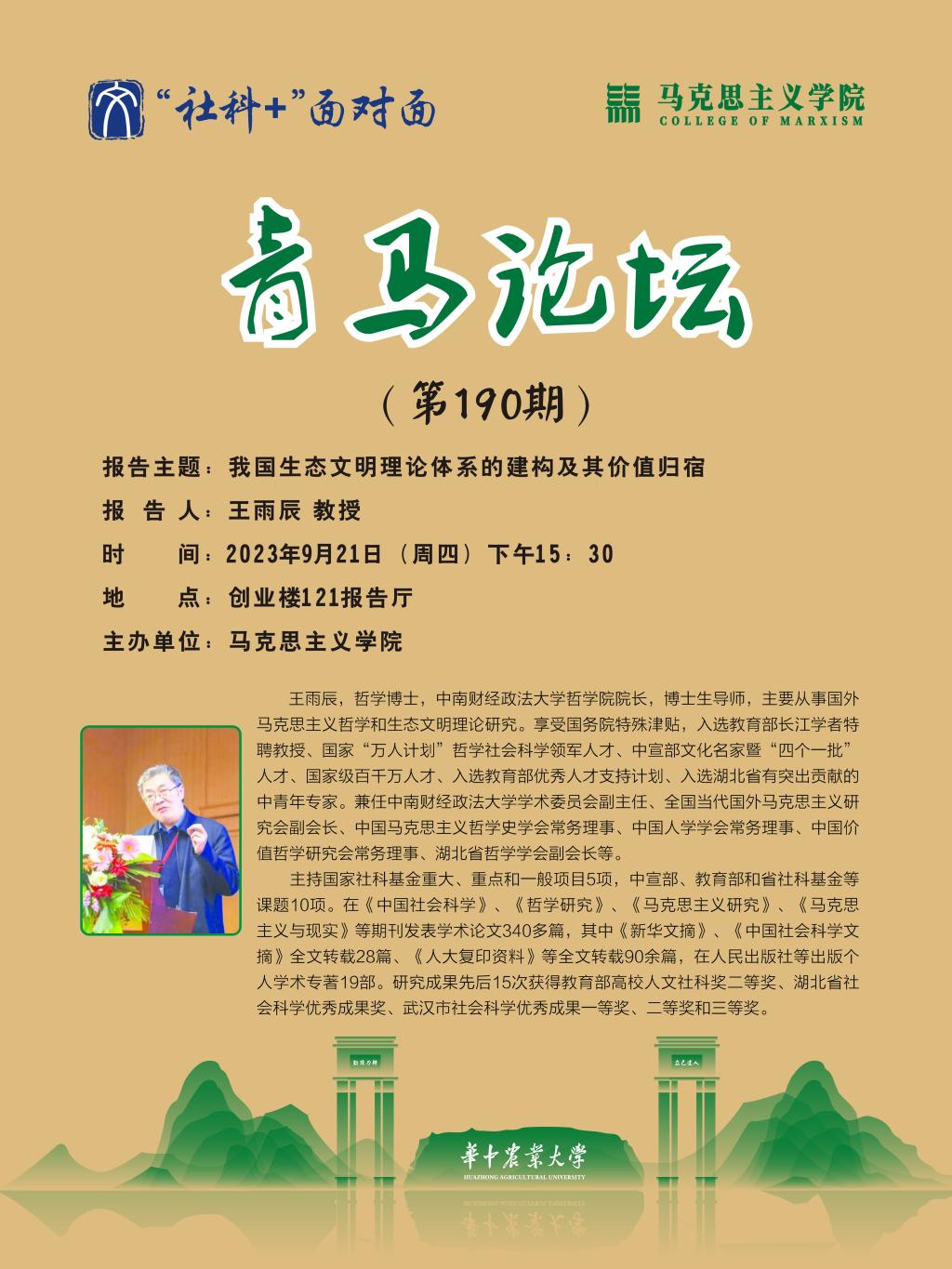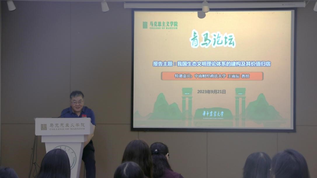 9月21日下午,第190期青马论坛在创业楼121报告厅举行。教育部长江学者特聘教授、中南财经政法大学哲学院院长、博士生导师王雨辰教授应邀作了题为“我国生态文明理论体系的建构及其价值归宿”的学术报告,报告由郭琰老师主持,学院部分教师和研究生参加。