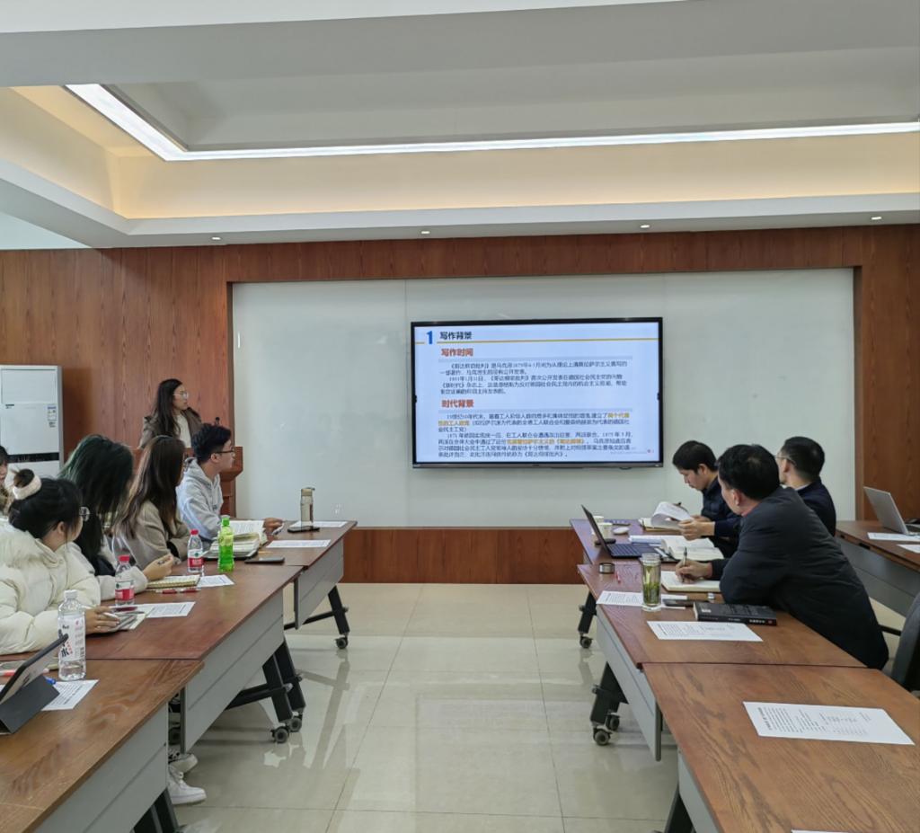 本期沙龙选取了马克思的著作《哥达纲领批判》,采取学生汇报、教师导读、师生交流等方式,围绕本书的主要内容和启示进行深入讨论。在学生汇报环节,江运齐同学围绕“如何理解社会主义社会‘还带着它脱胎出来的那个旧社会的痕迹’”这一个话题展开分析,从“无产阶级掌握政权后的伟大变革、作为过渡时期的社会主义、向共产主义过渡”三个大的方面进行讲解。他指出虽然无产阶级掌握政权后发生了伟大变革,但作为过渡时期的社会主义仍带着旧社会的痕迹。同时,他从分配方式、体脑差别两个方面阐述了社会主义向共产主义过渡的问题与举措。杜媛媛同学就本书的写作背景、本书意义及本书中的马克思主义公平观进行了分享,她提出,公平的分配在资本主义是不存在的,资产阶级的公平观念因其所固有的局限性,必然会在历史的发展和进步中被无产阶级的公平观念所超越,她从《哥达纲领批判》中关于公平的论述引入自己的思考,详细分析了按劳分配的问题。杜媛媛还将本书中的教育公平思想与我国教育现状结合在一起探讨,分析了生产劳动和教育结合的重要意义。