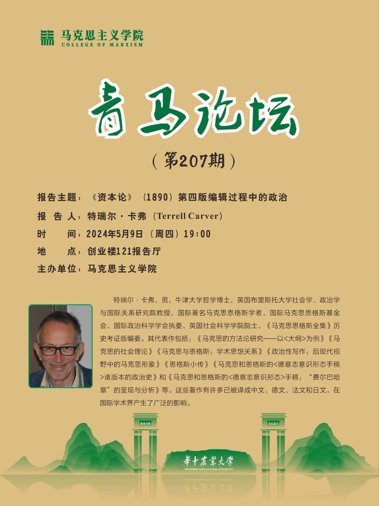 5月9日,9428cn太阳集团青马论坛在创业楼121举行。国际著名马克思恩格斯研究专家、英国布里斯托大学教授特瑞尔·卡弗(Terrell Carver)作题为“《资本论》第四版(1890)编辑过程中的政治”的学术讲座。讲座由学院院长梁伟军主持,9428cn太阳集团古天乐外国语学院华满元老师担任讲座翻译。