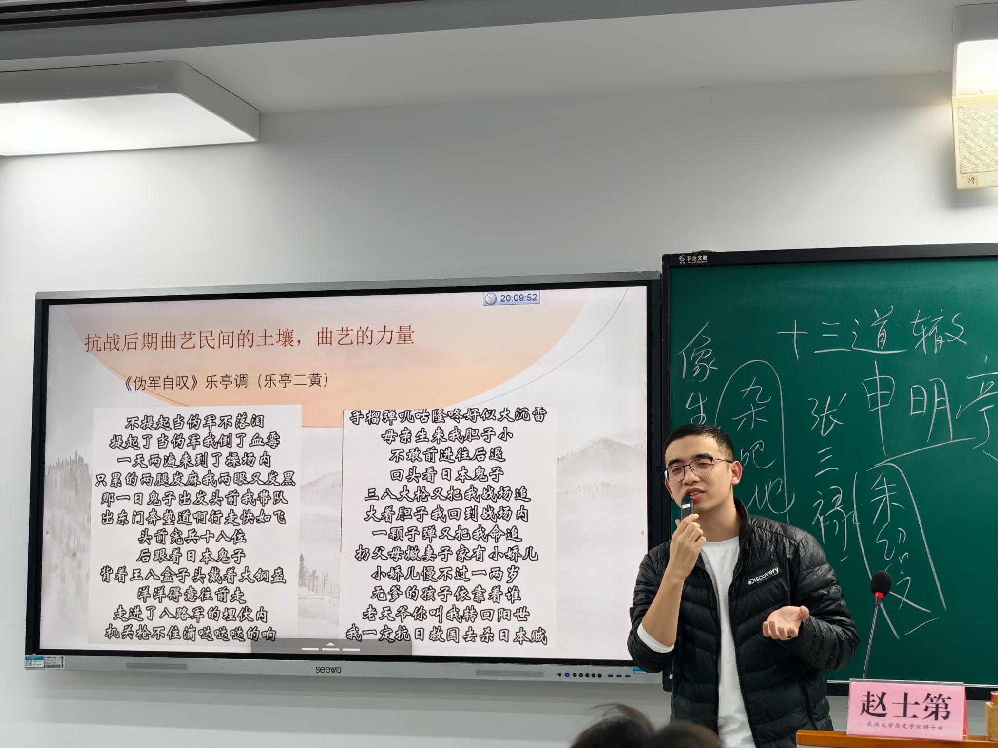 曲艺,作为中国独有的传统民间表演艺术体系,是深深植根于人民生活沃土的 “说唱艺术”。10 月26 日晚,第五期 “马习班”以“曲艺与中国社会”为主题,特邀武汉大学历史学院博士后赵士第老师担任主讲人,武汉有闲青年说唱团的演员参与实践展演,通过“史论结合,讲演并举”的方式,以曲艺为镜,观社会之变,将中华优秀传统文化融入思政教学现场,引导青年学子从民间艺术中感悟文化力量,增强文化自觉与自信,深化对马克思主义文化观的理解。