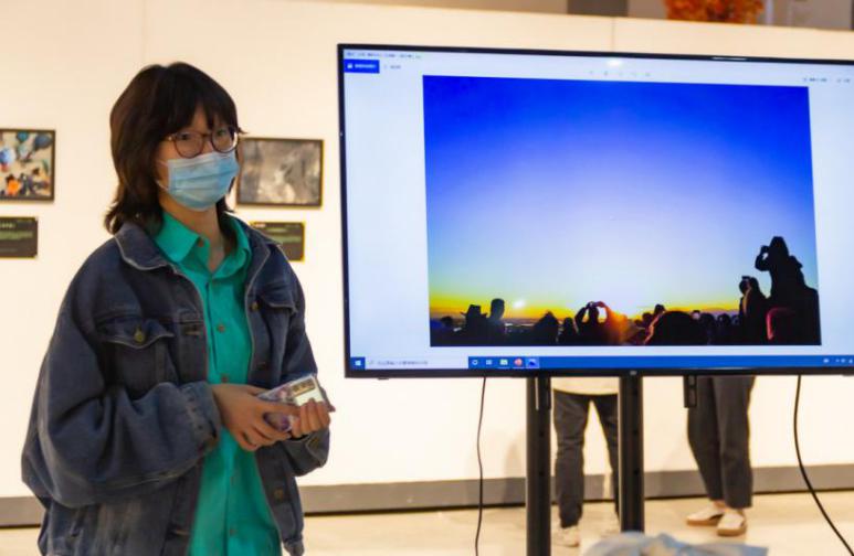 除了记录,摄影也有随性的一面。环工1901班的冀婧带来的是《秋日》。近乎国画的留白,墙壁上的蝴蝶近乎静止。“这让我想到自己童年时观察昆虫的经历,还有对于生命和自然的思索”,冀婧分享到。园林2002班的王诗颖的作品《追光者》亦是如此。“很多摄影师甚至一年中多次来到巴音布鲁克,只为拍到那里的落日奇观。当时人山人海,《追光者》就是在人群中完成的。”