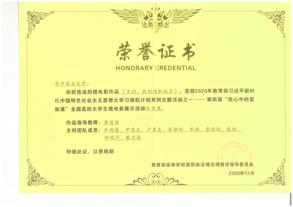 1月8日,第四届“我心中的思政课”全国高校大学生微电影展示活动获奖名单公布。在黄运丽老师的指导下,乔雨豪同学团队作品《乡村,我的诗和远方》获全国高校大学生微电影展示活动优秀奖。