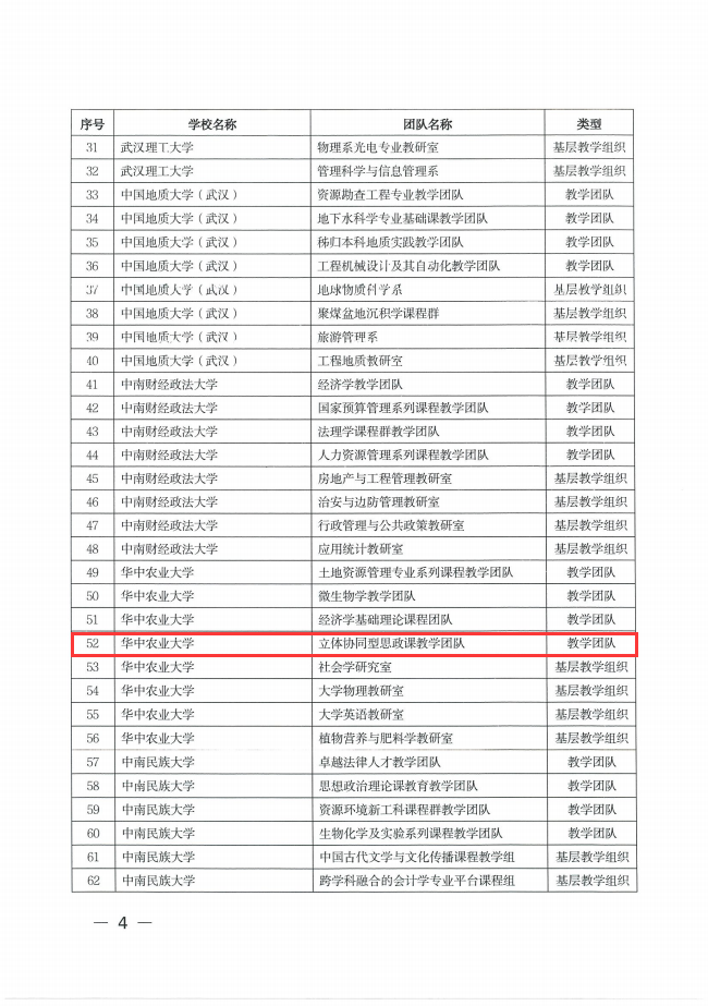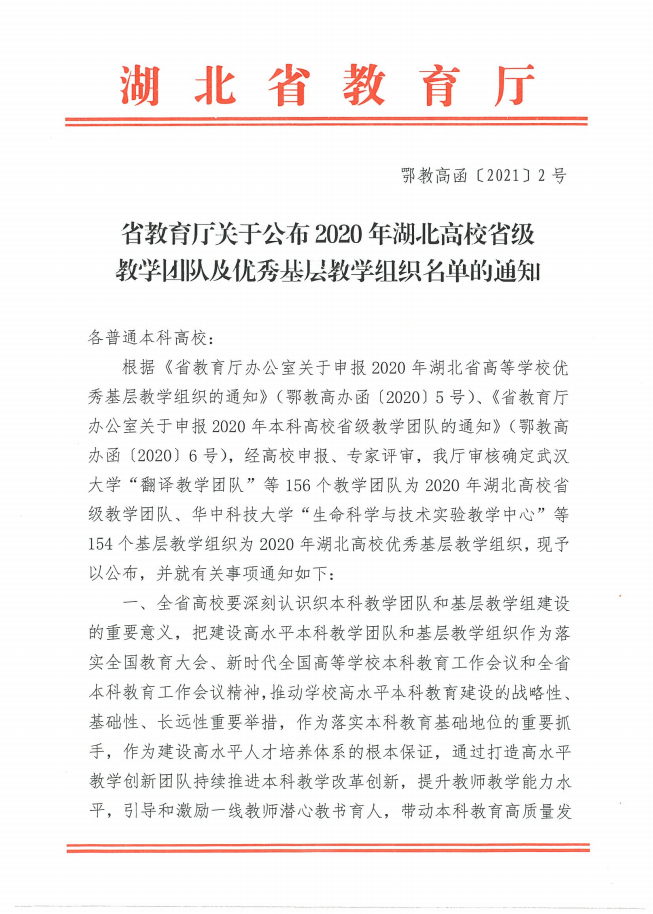 据悉,本次全省共有156个教学团队被确定为2020年湖北省高校省级教学团队,154个基层教学组织被确定为2020年湖北高校优秀基层教学组织。
