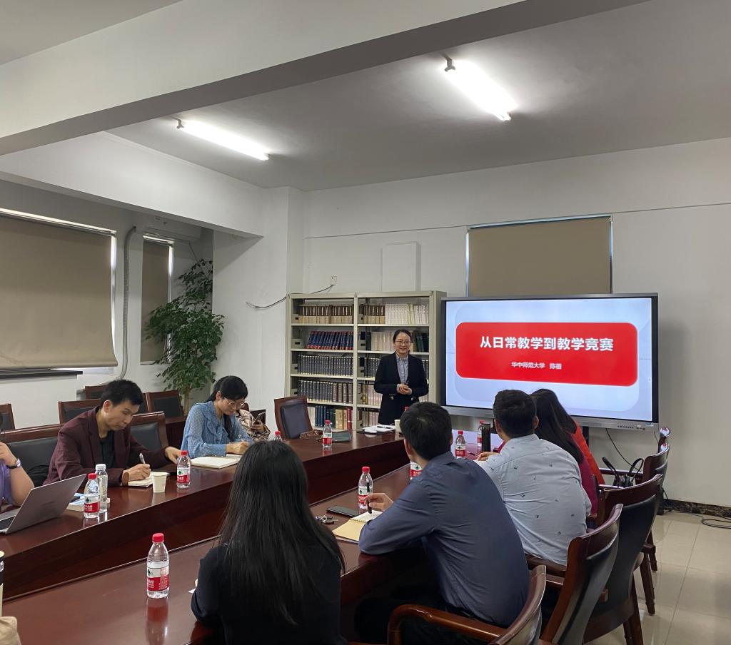 此次集体备课会邀请了湖北省第七届高校青年教师教学竞赛一等奖获得者、华中师范大学文学院青年教师陈蓓作为主讲嘉宾。陈蓓老师以“从日常教学到教学竞赛”为题,围绕解读竞赛规则、优化日常教学、转化竞赛成果等进行了精彩的教学分享。她强调,要做到教学理念先进、学情分析准确、教学内容充实、板书设计合理;在教学理念上应以学生为中心,在授课环节中须突出重难点,注重教学方法的多样性与灵活性,关注教学选题的完整性、逻辑性、学术性与趣味性。她提出,教师的日常教学是规范和常态,教学竞赛是日常教学基础上的深化和创新。教学竞赛最终要回归到日常教学上,以更高的要求形成示范性教学。