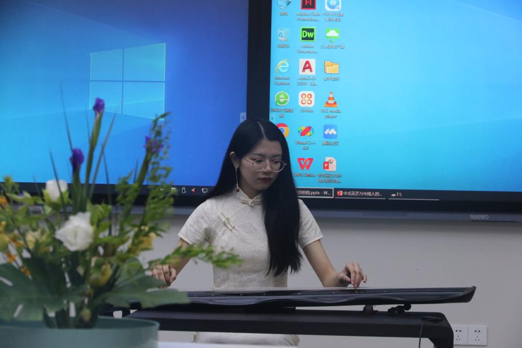 活动邀请了园艺林学学院副教授王媛媛、研究生杨雪,分别就中式花艺的理论知识和科学研究进行介绍。王媛媛老师以“拈花自怡悦——浅述中国插花艺术花文化”为题,详细介绍了中式插花艺术的悠久历史及特点,她强调中国插花艺术是自然之真、人文之善、艺术之美和圣洁之尊的融合,讲求由“心正花正”转入“花正心正”的怡情养性的心理调节过程。