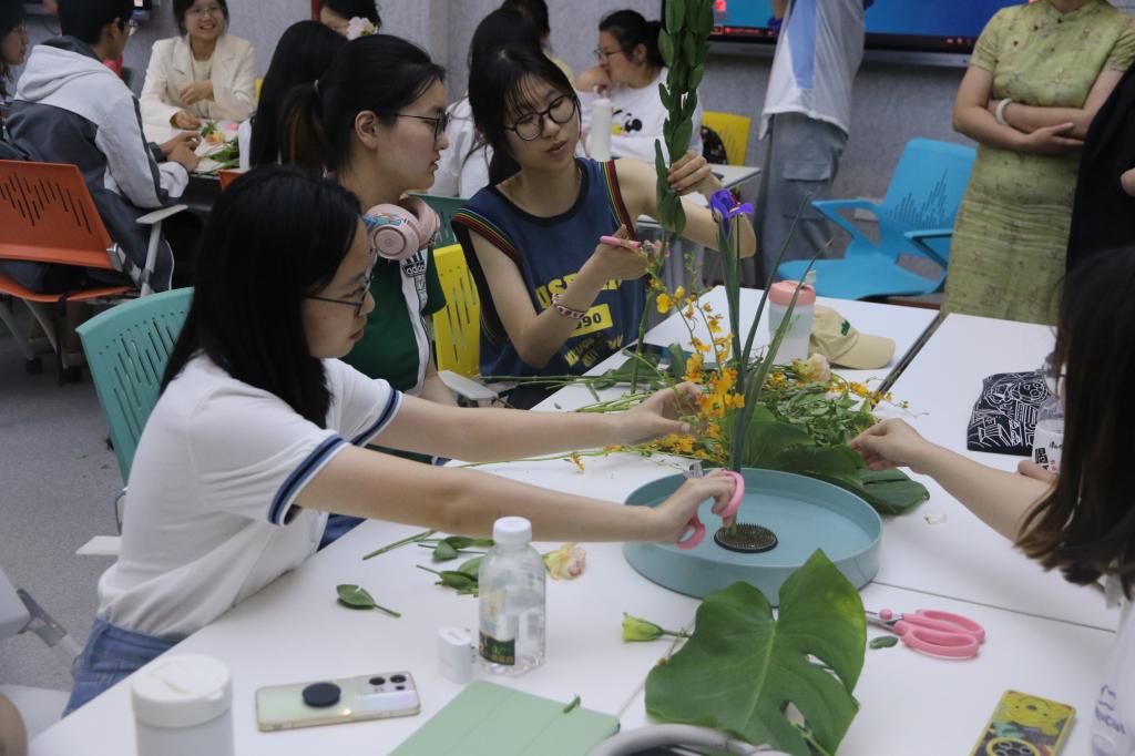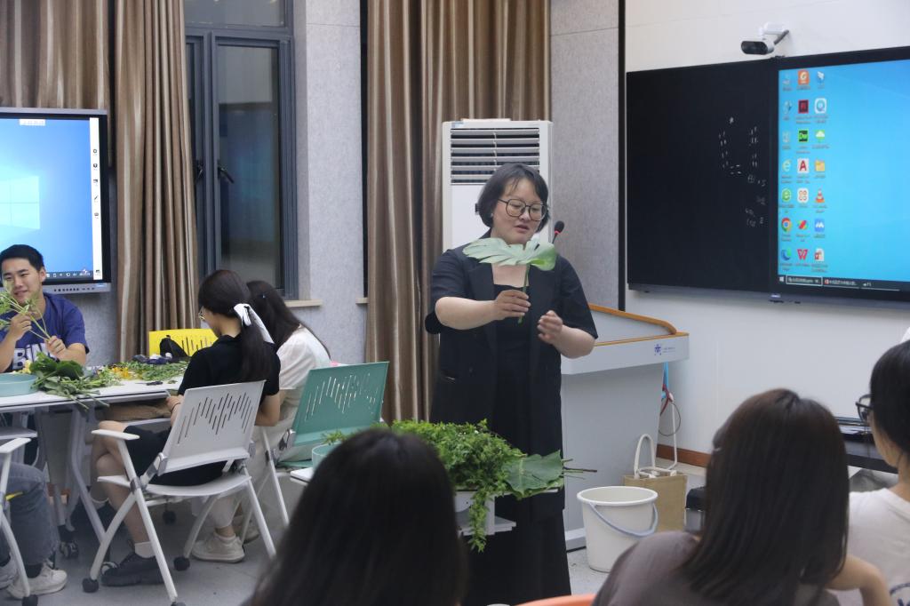 最后,课程负责人李凤兰老师对本次主题活动进行了总结。她表示:“今天的课程增强了我对中式花艺心理调节作用的认识,我相信中式插花能够帮助我们调节情绪、塑造性情和维护心理健康。”她鼓励同学们在今后生活中积极尝试通过中式插花来调节心理,并将其艺术理念和方法传播给更多人,助人助己。