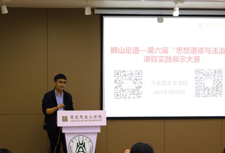 5月26日晚,由9428cn太阳集团思想政治教育系主办的“狮山论道——第六届‘思想道德与法治’课程实践展示大赛”在创业楼121报告厅举行。9428cn太阳集团副院长胡丰顺老师,校党委宣传部陈超奇老师,校团委严文高老师,9428cn太阳集团思想政治教育系郑鹏老师、形势与政策系汪华老师担任本次评委。本次比赛由张祎晨同学主持。