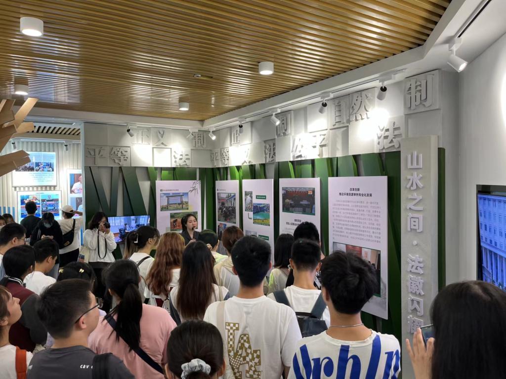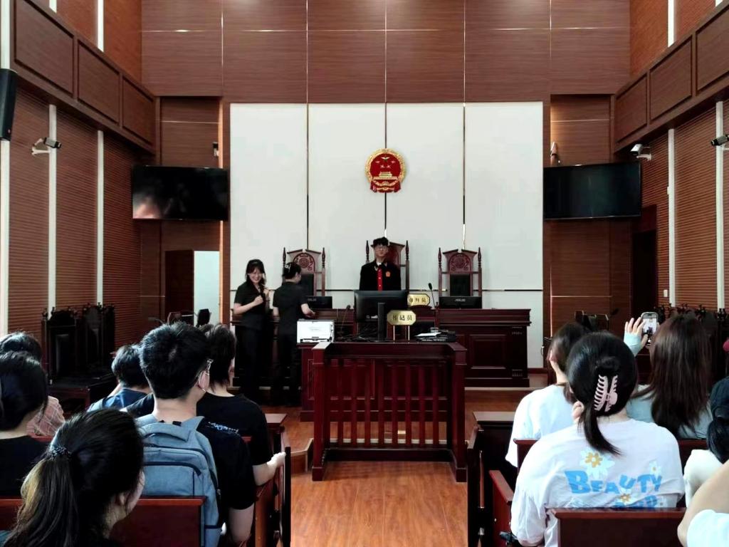 走进法庭,法官带领同学们参观了五里界人民法庭。在立案大厅,法官着重为同学们介绍了江夏区资源分布、环保法治工作的成就和经验及环资审判法庭的责任与使命。在大审判庭,法官为同学们详细介绍了庭审过程中原告被告、诉讼代理人、审判长、审判员、书记员等角色及案件从立案到结案的诉讼程序、审判流程等。随后,法官带领同学们进行了一场法庭审判模拟体验,同学们积极进行角色体验。学生代表身着法袍、手握法槌、坐上法椅,沉浸式体验案件审理时的法庭威严、法律精神和法治力量。在文化展厅,法官为同学们耐心解说生态保护经典案例,同学们深刻理解环境资源审判修复性司法理念、认真学习绿色司法的新知识。通过法庭参观,同学们更深刻理解了习近平法治思想和生态文明思想,更透彻把握了书本上的全面推进依法治国和建设社会主义生态文明的国家重大决策。同学们纷纷感概:“法治中国和美丽中国建设既需要法律保驾护航,也需要大家共同努力。我们要认真学习理解掌握书本理论知识,熟练运用理论知识,结合现实需要,积极投身到国家建设中去。”