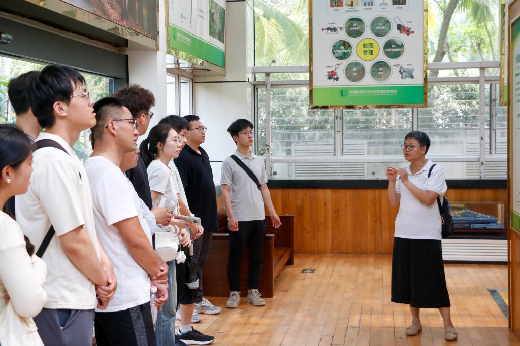 在海口热带农业科技博览园副研究员龙翊岚带领下,研学团参观了天然橡胶陈列馆、热带作物品种资源展示园以及国家热带农业科技创新中心等科普主题馆园。龙翊岚向师生们详细介绍了天然橡胶的“前世与今生”,生动讲述了一代代科研工作者如何一步步破除技术壁垒,推动天然橡胶实现全方位产量突破和全链条科学化生产的系列艰难光辉历程。她谈到:“中国热科院认真落实习近平总书记关于‘打造国家热带农业科学中心’‘做强做优热带特色高效农业’的重要指示,始终秉承以科技创新推动农业强国建设。”