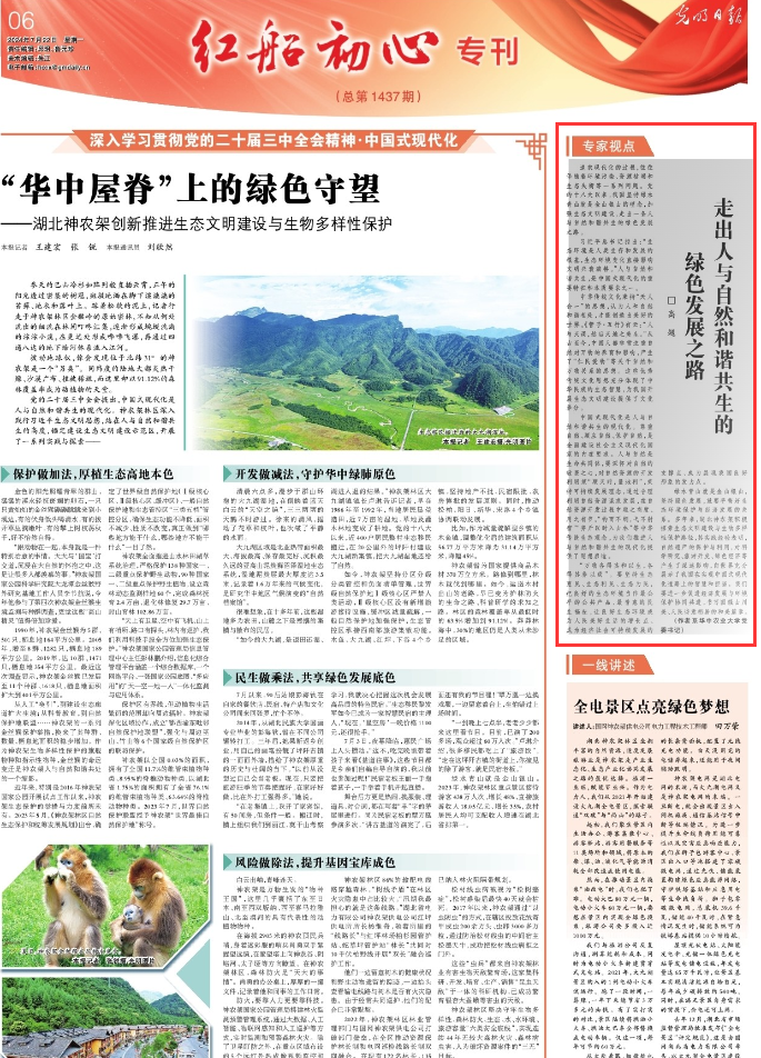 绿水青山就是金山银山,坚持绿色发展,就要平衡好生态环境保护与经济发展的关系。多年来,湖北神农架积极探索生态文明建设与生物多样性保护路径,其实践经验表明,自然遗产的保护与利用,对科学研究、旅游开发、绿色经济等产生了深远影响,向世界充分展示了我国在实现中国式现代化道路上的智慧和担当。我们要进一步促进经济发展与环境保护协同共进,书写国强山川美、人民诗意栖居的和美篇章。