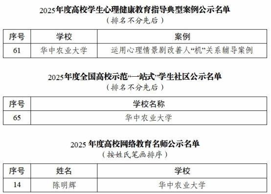 近日,教育部公示了2025年度高校思想政治工作质量提升综合改革与精品建设项目遴选结果,我校3个项目入选,其中高校学生心理健康教育指导典型案例项目1项、全国高校示范“一站式”学生社区项目1项、高校网络教育名师项目1项。马院陈明辉老师入选高校网络教育名师。自2018年教育部启动该项目建设工作以来,学校连续第7年入选。截至目前,我校累计10个项目入选(含本次入选名单)。