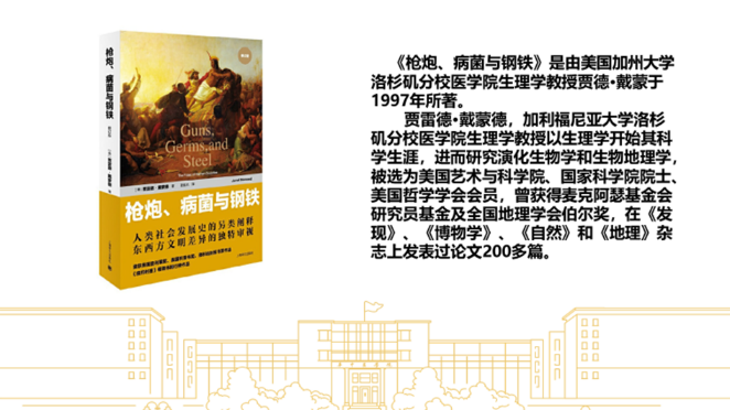 7位同学以书籍为载体,分享了自己的思考和收获。汪书怡同学为大家推荐的书目是《中国在梁庄》。这本书以一种更偏“文学”的视角进入乡村问题的研究,关怀到梁庄中的每个“人”。汪书怡从六个方面介绍了书的主要内容,以期为乡村研究提供一个新的视角。焦丽丽同学分享的书目是美国政治学家杜鲁门的代表作《政治过程——政治利益与公共舆论》。她介绍了该书的整体框架和主要观点,最后指出在读书时要以辩证的思维去看待作者的观点,不能人云亦云。郑金丽同学带来了《菊与刀》的分享,简明扼要地介绍了作者从他者的角度对日本文化中看似矛盾的方方面面的阐释和解说,让与会同学深切地体会到了“菊”是日本皇室的象征,“刀”是日本武士道精神的体现。赵祥宇同学以“人与自然是彼此庇佑的生命共同体”为主题分享了美国作家贾雷德·戴蒙德的《枪炮、病菌与钢铁》,该书用详实的论据和丰富的例子告诉证明了决定不同文明发展的核心因素并不是人类的生物差异,而是大陆环境的差异。易宗星同学和卢奕辰同学分别分享了小说《围城》和《追风筝的人》,讲述了两个发生在不同时代、不同国家的跌宕起伏、令人深思的故事。张静同学分享了中国古代哲学作品《道德经》,从修身、治国、用兵、养生四个层面为大家讲述了道家的主要哲学思想。