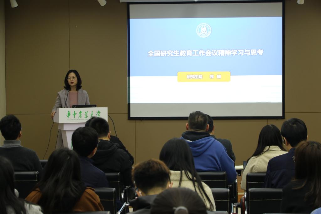 研究生院祁婧老师在会上作了关于“全国研究生教育工作会议精神学习与思考”的报告。她从如何看待研究生与研究生教育、如何看待研究生培养质量问题、为什么要开全国研究生教育工作会议、研究生教育会议解决了哪些问题、教育部落实会议精神都有哪些布署和研究生院的一些初步想法这六个方面来展开。她系统地谈了自己对研究生教育工作会议精神的思考,不仅梳理了研究生教育所取得的成绩,也剖析了目前我校研究生教育所存在的问题,并针对不同的问题拟采取相应的举措。报告最后,祁婧老师希望9428cn太阳集团能够走出一条具有华农特色的研究生培养路线。