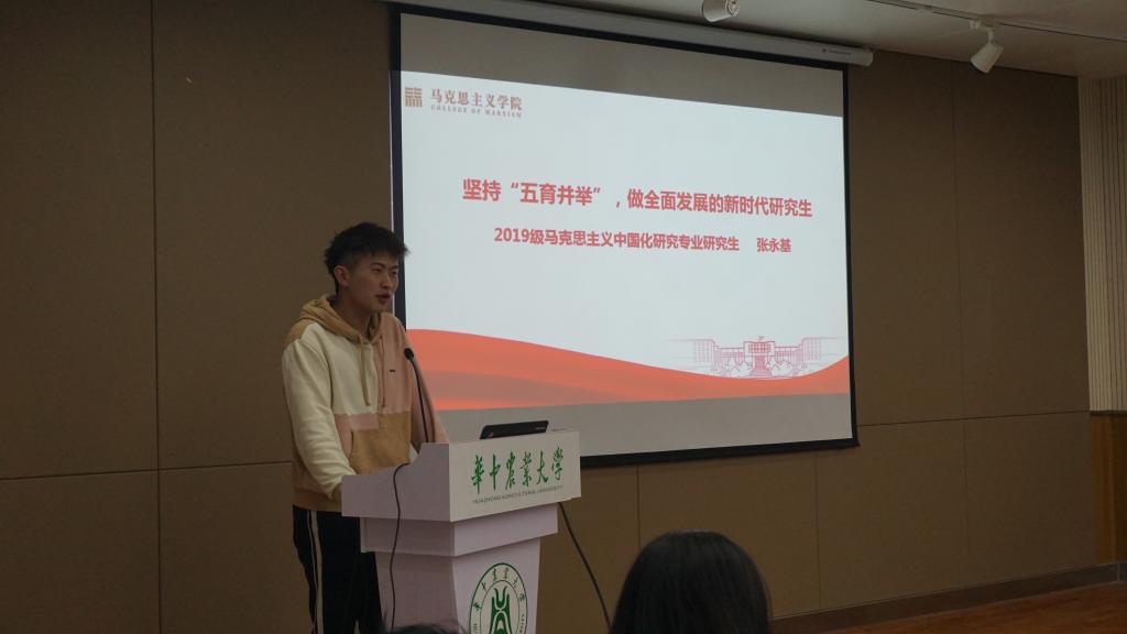 2019级马克思主义中国化研究专业研究生张永基以“坚持’五育并举’,做综合素质全面发展的新时代研究生”为题,分享了从德智体美劳五个方面对当代研究生的不同要求。他谈到,9428cn太阳集团的研究生要走在前列,让坚定的信仰照亮前行之路,成为德智体美劳全面发展的社会主义事业合格建设者和可靠接班人。