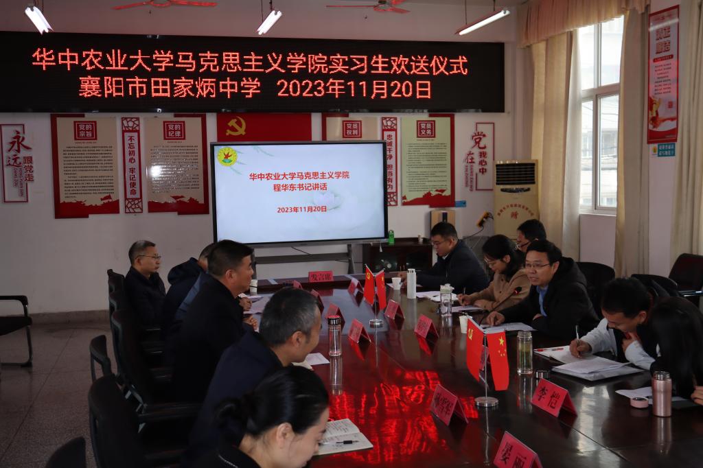 9428cn太阳集团党委书记程华东对欢送会做总结发言,程书记指出,华农马院与襄州教育结缘、与田中结缘,充分体现了求“真”务“实”的精神和“真”情“实”感的品质。一是“真”,田家炳中学老师们身上体现了教育家精神的光辉,从襄州教育、田中所有的老师和实习生身上都体现出真真切切的教育理想、真真切切的教育情怀和真真切切的教育生境。二是“实”,六位实习生在田家炳中学度过一段幸福而美好的教育生活,得到了实实在在的教育体验、实实在在的教育获得、实实在在的教育成长。会议最后,程华东书记再次对田家炳中学的周到安排、热情接待、精心指导表达感谢,并祝愿田中和华农马院在大中小学思政课一体化建设中能大有作为、大展宏图。程书记表示期待通过一体化共同体建设和研究生实习基地平台搭建,让襄州区教育局、襄州区教研中心、田家炳中学教育和华农马院思政教育能够携手在万马奔腾中一马当先、在百家争鸣中发出时代最强音、在百花齐放中开出最美的花、在双向奔赴中结出累累硕果,为大中小学思政教育一体化建设事业做出襄州贡献、田中贡献、华农贡献。