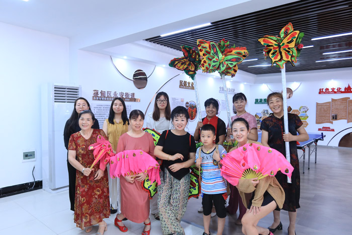 在永安街道综合文化站,实践团队仔细参观了站内的非遗展示厅、综合文化厅等设施,并与“扑蝴蝶”项目传承人曾平兰团队就非遗数字化保护路径深入交流。曾平兰讲述了“扑蝴蝶”的发展历史及现状,着重介绍了“数字化”在“扑蝴蝶”项目中的具体应用。蝶舞艺术团队员徐满英说道,“通过影音采录等数字化手段,我们完成了对‘扑蝴蝶’传承人口述史、技艺流程等的数字化采集与保存,并利用蔡甸区‘公共文化服务云平台’等进行广泛宣传,让‘扑蝴蝶’得到了更好传承。”