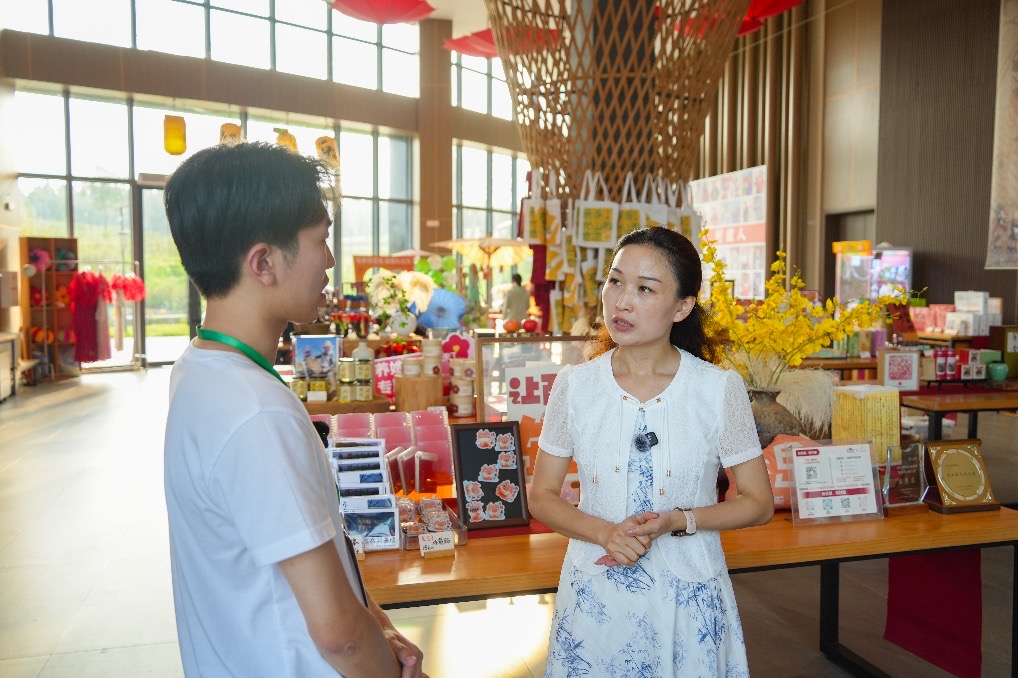 转场光山县东岳村,扑面而来的是浓郁的文化气息。色彩斑斓的刺绣香囊、栩栩如生的虎头鞋、独具特色的农具模型,一件件传统手工艺品让学子们目不暇接。“余粮乡创”负责人崔红梅介绍:“近年来,东岳村加大非物质文化遗产的保护与传承力度,新建成花鼓戏传承中心,利用各种节假日,将特色表演搬进景区,不仅更好地传承了非遗,还实现了村民增收致富。”