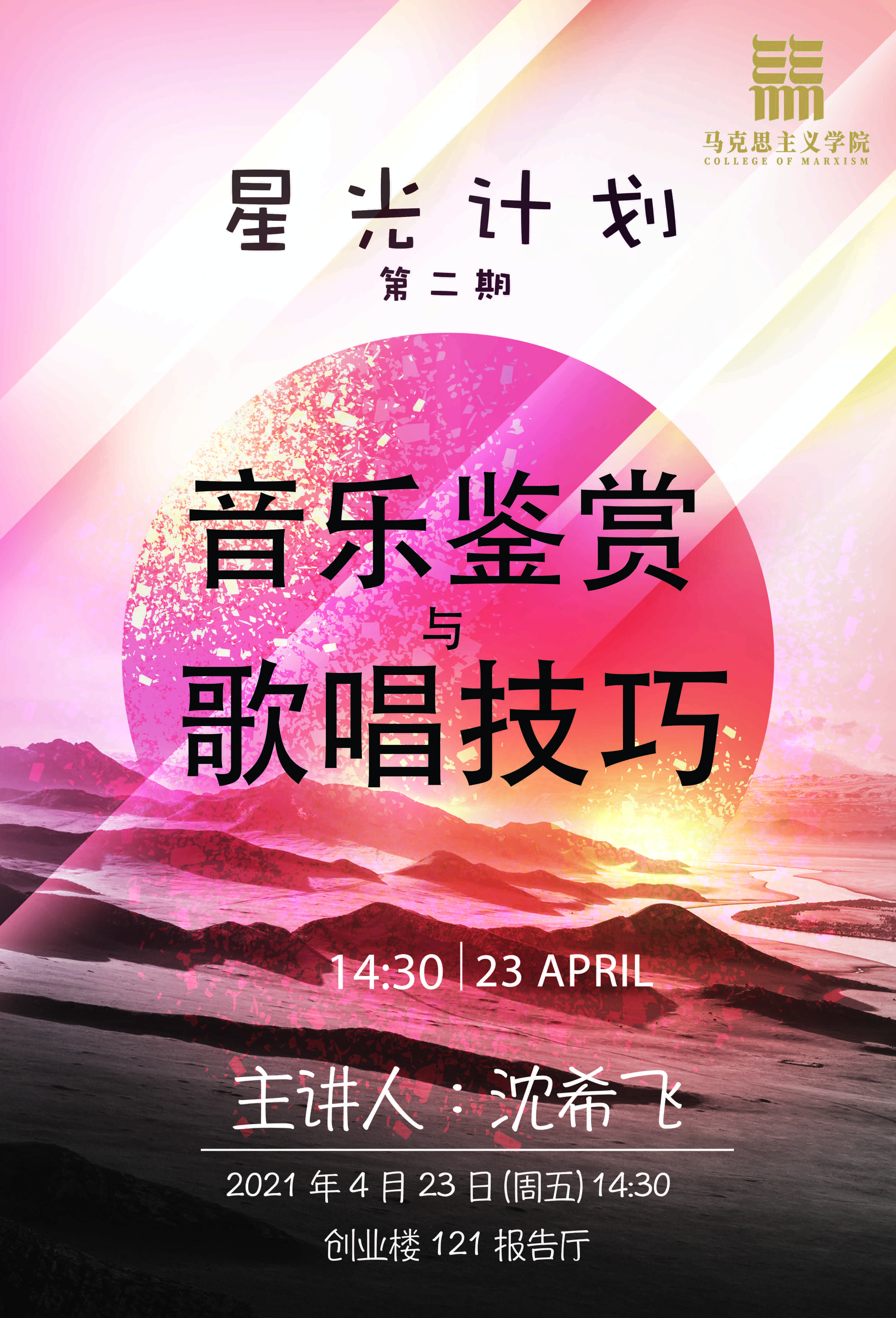 4月23日下午,马院研究生能力素质提升“星光计划”第二期“音乐鉴赏与歌唱技巧”主题讲座在创业楼121报告厅成功举办,学院部分师生及歌唱爱好者参加了本次活动。活动邀请校团委艺术教育中心沈希飞老师主讲,学院研究生会主席杜彧坤主持。