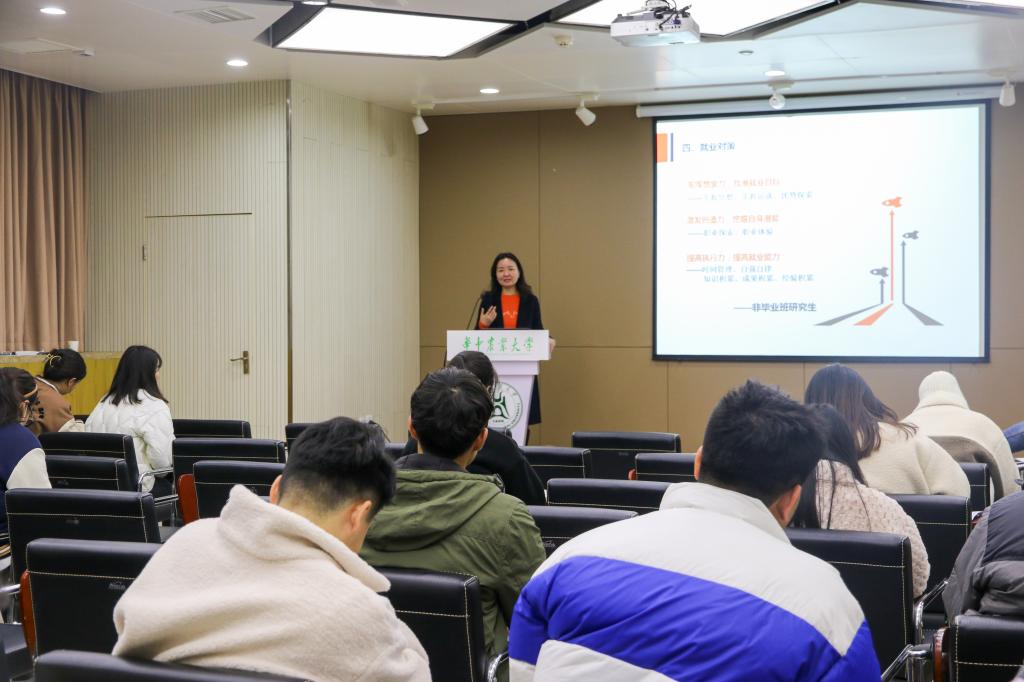 任丹开门见山、一针见血地指出研究生进行职业定位的重要性,强调“求职之路,始于定位”。她从职业定位的价值、职业定位的维度、职业定位的方法三个方面为同学们进行了讲解。
