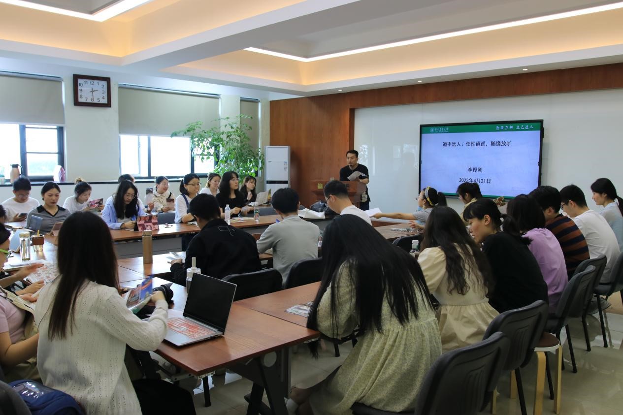 4月21日下午,9428cn太阳集团2023年研究生“学术下午茶”活动在创业楼511举行,本次活动邀请了思想政治教育系副教授李厚刚老师,他以“道不远人:任性逍遥,随缘放旷”为主题,与同学们分享治学和人生经验。
