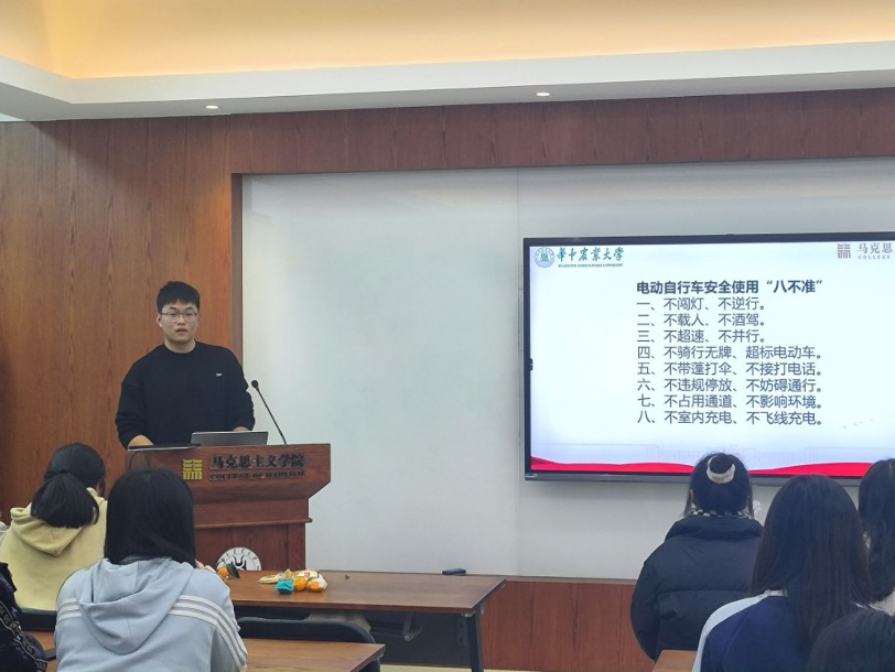 班会首先开展冬日安全意识宣讲,随着气温逐渐降低,寒冷天气频繁,冬季安全问题也逐渐成为安全教育的主题,在冬季道路结冰、能见度差的情况下,使用电动自行车通勤的同学更要注意谨慎骑行,安全驾驶,及时检查车辆性能,无论校内校外使用电动车都要严格遵循“电动自行车安全使用‘八不准’”,做到不闯灯、不逆行、不载人、不酒驾、不超速、不并行、不骑行无牌、超标电动车等,谨记规范、严格执行、珍惜生命、守护安全,安全教育由班长史玉豪带领同学们集体学习,并由张圆梦老师作安全教育提醒。