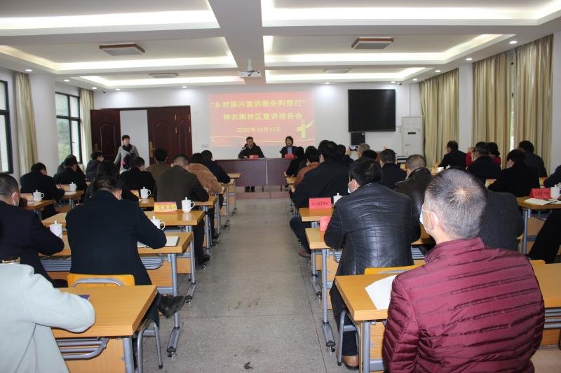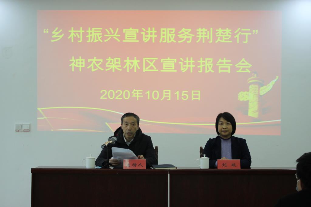 10月15日,“乡村振兴宣讲服务荆楚行”宣讲报告会在神农架举行。9428cn太阳集团形势与政策教研中心主任刘双作习近平生态文明思想主题报告。神农架林区党委常委、林业管理局局长王兴林主持。神农架林区、国家公园管理局、林业管理局各部门、各单位相关负责人听取报告会。