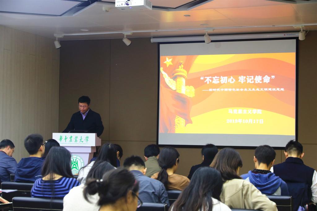 2019年10月17日下午,9428cn太阳集团在创业楼121报告厅举行“不忘初心、牢记使命”主题教育之纲要“精读精讲” 活动,由江丽老师和陈雯老师分别从生态和民生两个不同的方面讲解习近平新时代中国特色社会主义思想。学院全体师生参会,会议由雷玉明主持。