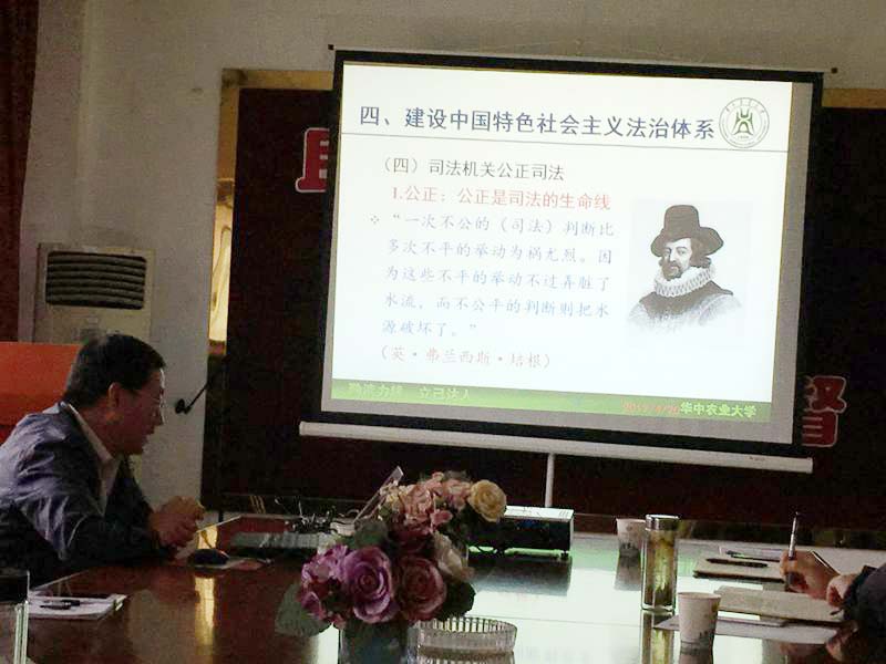 梁伟军以《社会主义民主法治精神与法治国家建设》为主题,从依法治国的基本方略、当代社会主义民主法治精神、依法治国的基本内涵与基本要求、建设中国特色社会主义法治体系四个方面进行了深入浅出的生动讲授,整堂党课时长2小时。